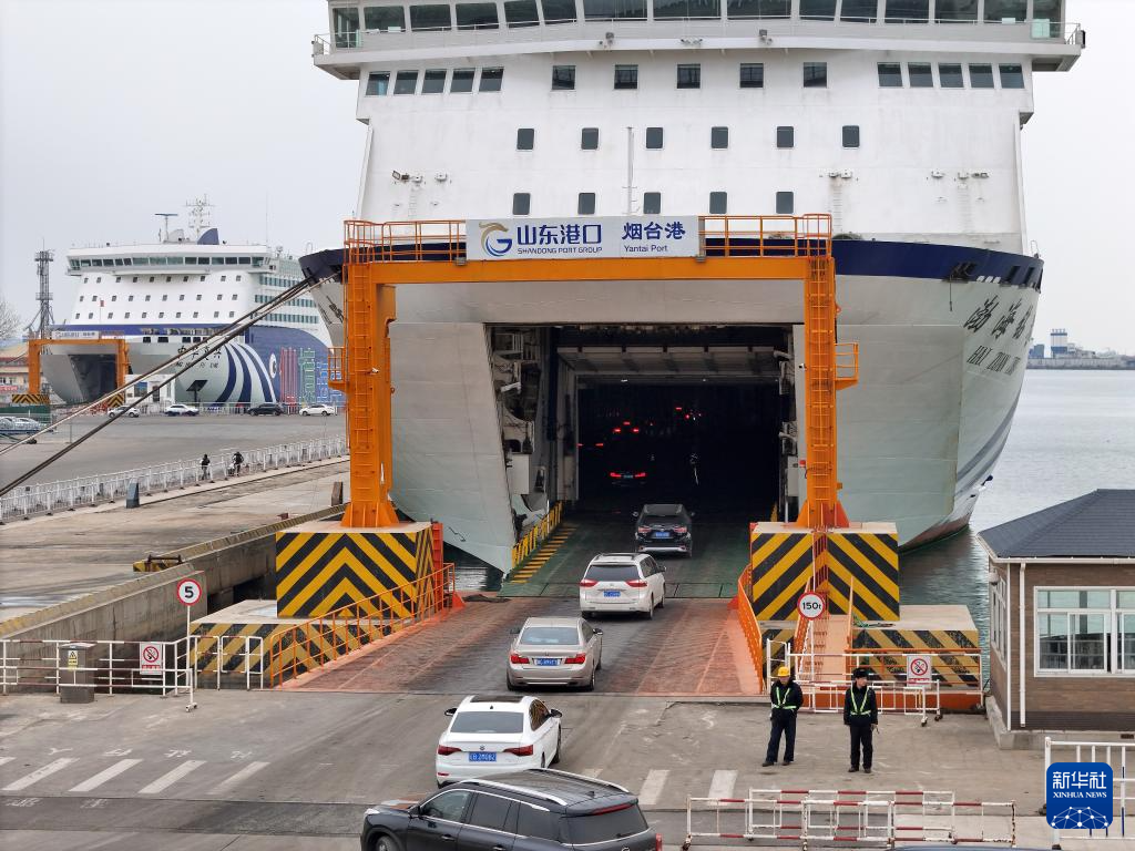 3月5日,在山东港口烟台港,车辆有序驶入“渤海钻珠”号客滚船前往大连(无人机照片)。