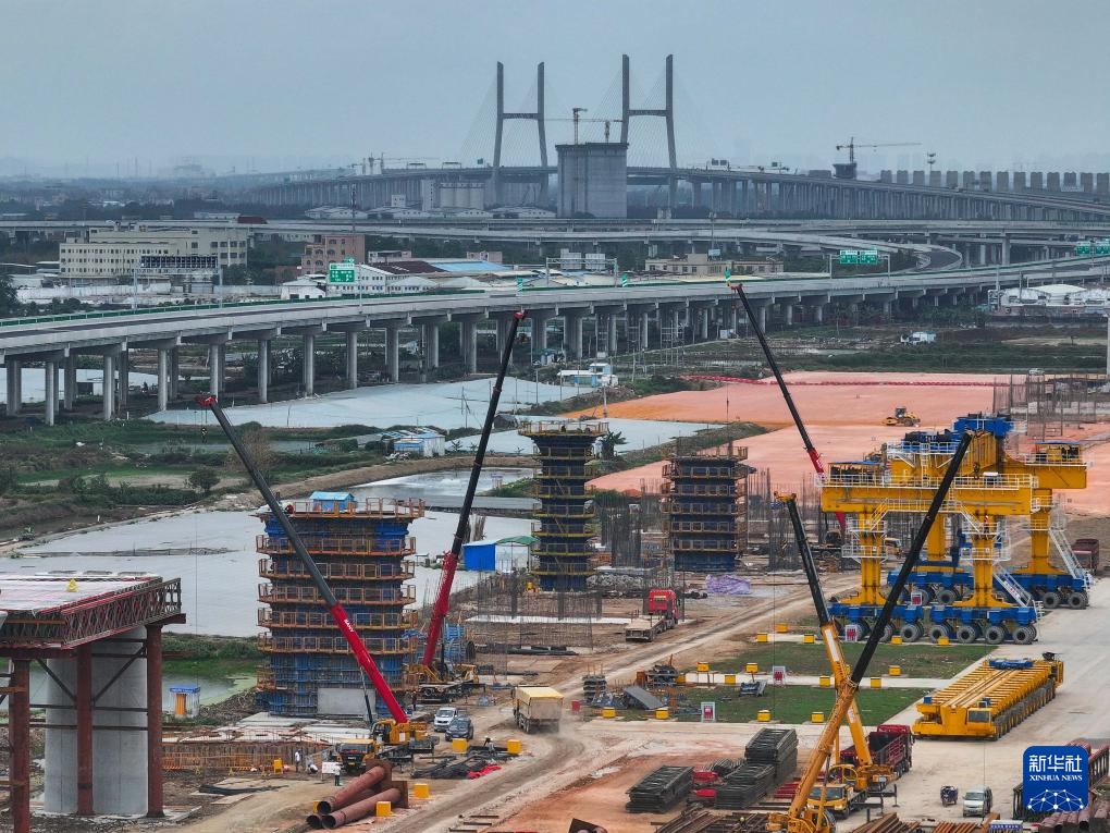 深江铁路中国铁建大桥局中山制梁场紧邻线路架设桩基(4月3日摄,无人机照片)。