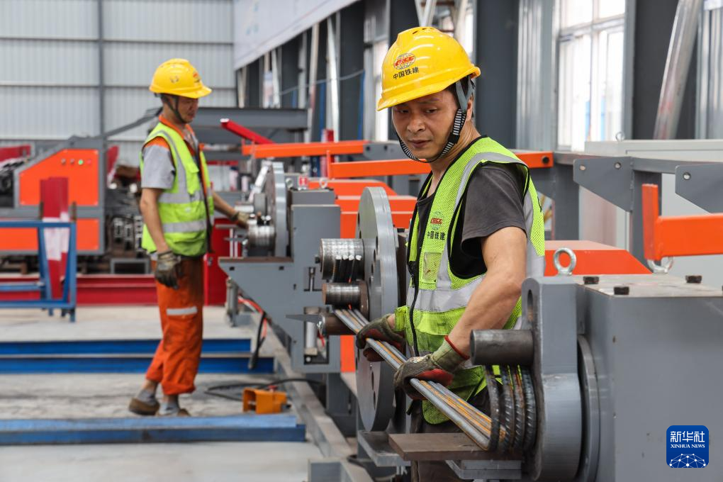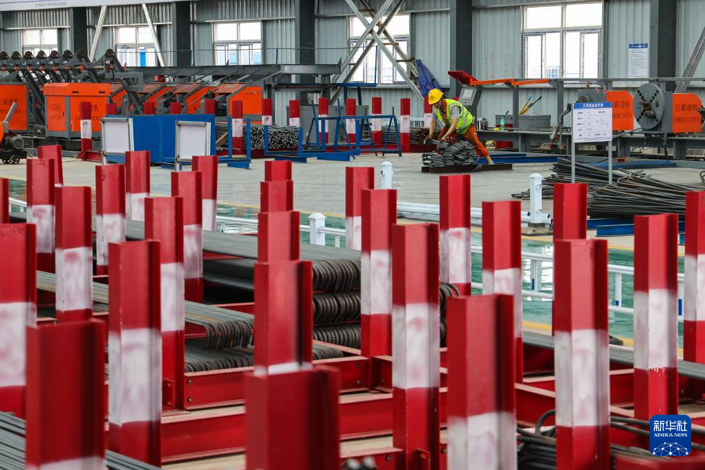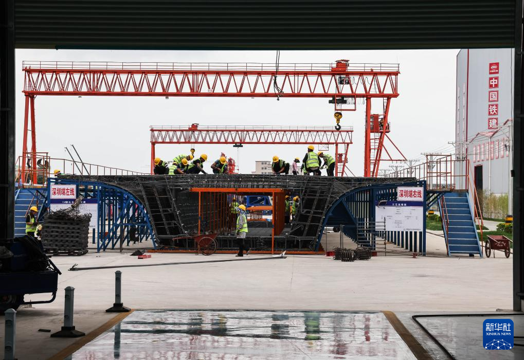 4月3日,施工人员在深江铁路中国铁建大桥局中山制梁场进行钢筋预制。