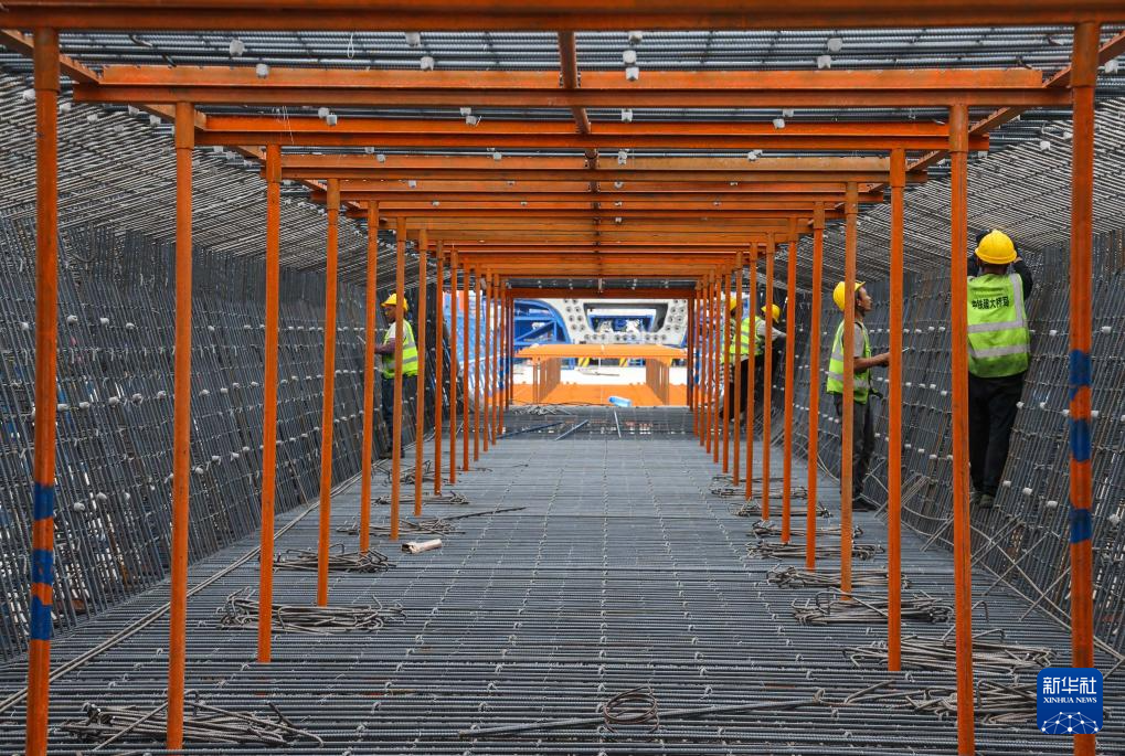 4月3日,施工人员在深江铁路中国铁建大桥局中山制梁场进行预制箱梁钢筋绑扎。