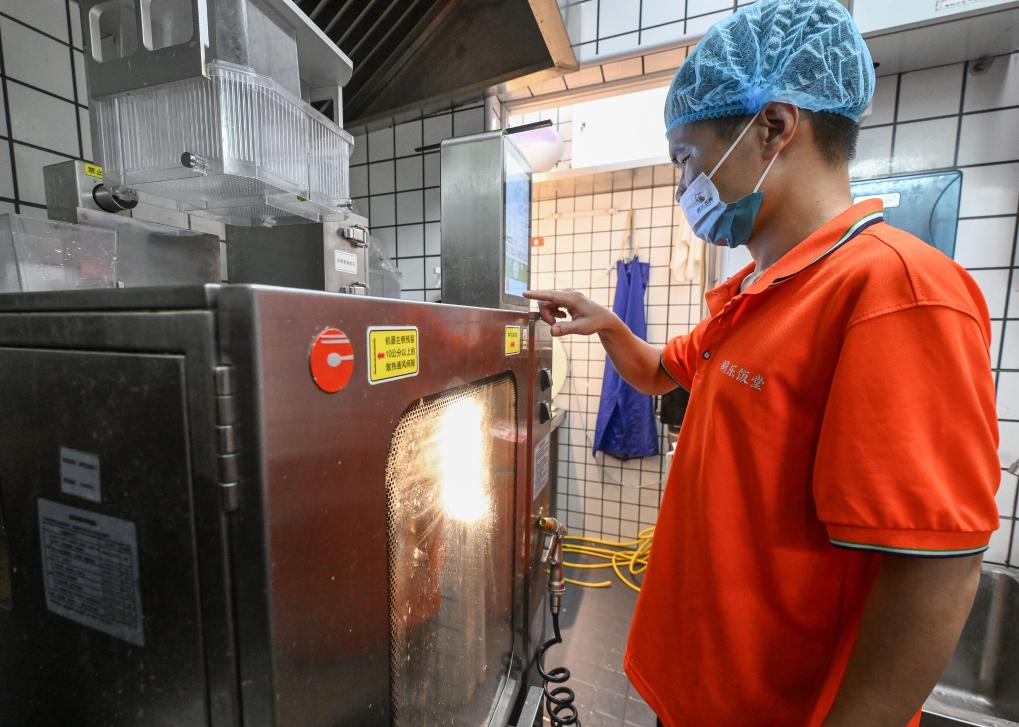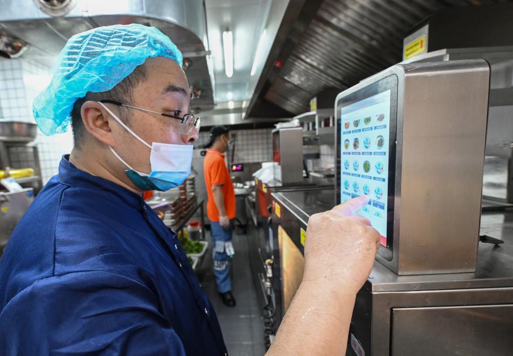 在广州市荔湾区的南源街道长者饭堂后厨,一名厨师使用炒菜机器人协助烹饪(7月24日摄)。新华社记者 李贺 摄