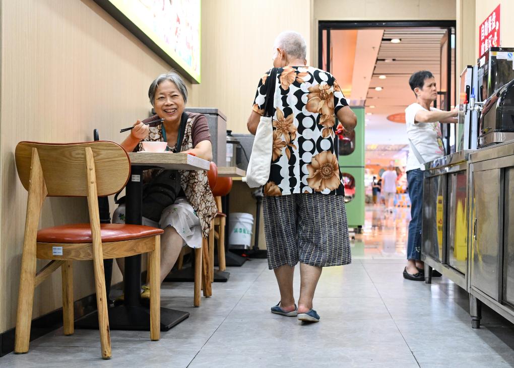 在广州市荔湾区的南源街道长者饭堂内,老年人在用餐(7月24日摄)。经过防滑处理的地面让老人行走更加安全。新华社记者 李贺 摄