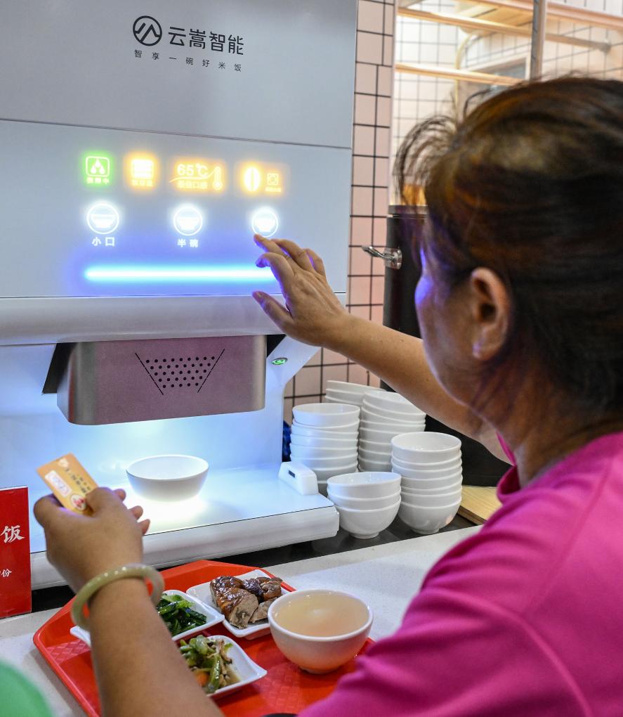 在广州市荔湾区的南源街道长者饭堂,一名用餐的老年人使用智能自动分饭机盛米饭(7月24日摄)。新华社记者 李贺 摄