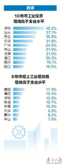 具体到各地市,深圳(49.2%)、汕头(37.1%)、茂名(35.9%)、云浮(31.8%)、广州(24.6%)、中山(21.0%)、河源(21.0%)、湛江(20.3%)、梅州(18.1%)、阳江(16.5%)10个地市的工业投资增速均高于全省水平。