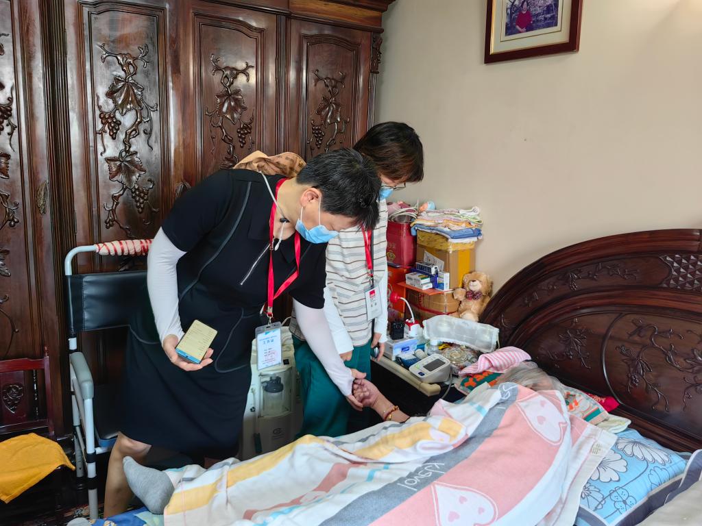 上海市普陀区老年照护统一需求评估员李颖芳(图左)与社区医生一同为老人做照护需求评估。新华社记者吴振东 摄