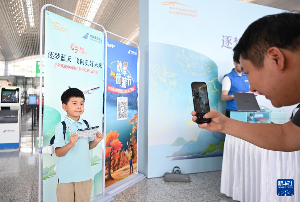 9月19日,乘坐南航C919首航航班的旅客在广州白云国际机场航站楼拍照留念。新华社记者 邓华 摄