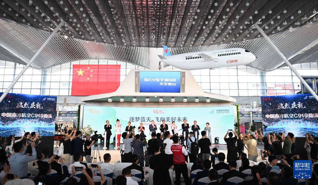 这是9月19日在广州白云国际机场航站楼拍摄的南航C919首航仪式。新华社记者 邓华 摄