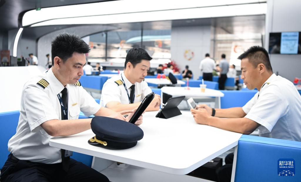 9月19日,南航C919首航机组成员在进行飞行前准备工作。新华社记者邓华 摄