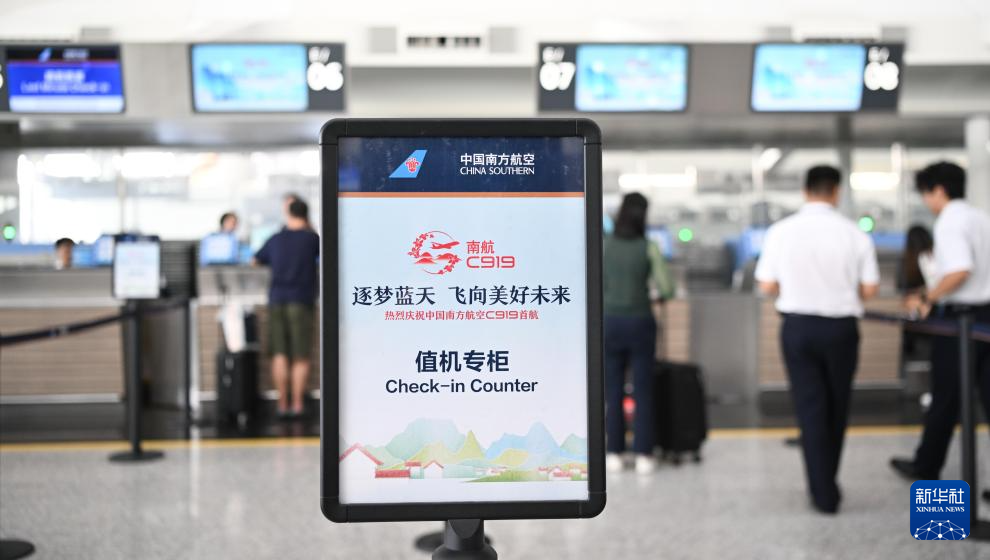 9月19日,旅客在广州白云国际机场的南航C919首航航班柜台值机。新华社记者 邓华 摄