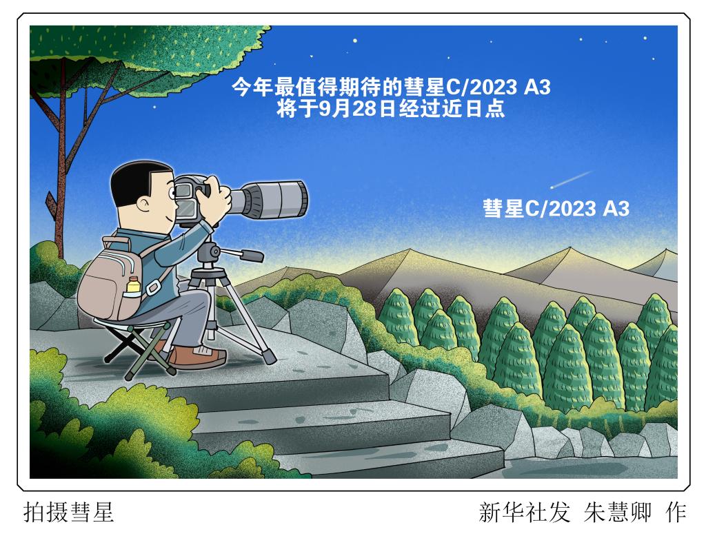 今年最值得期待的彗星C/2023 A3(Tsuchinshan-ATLAS,又称紫金山-阿特拉斯)将于9月28日经过近日点。天文爱好者们可在日出前1小时,使用专业相机于东方低空尝试拍摄。新华社发 朱慧卿 作