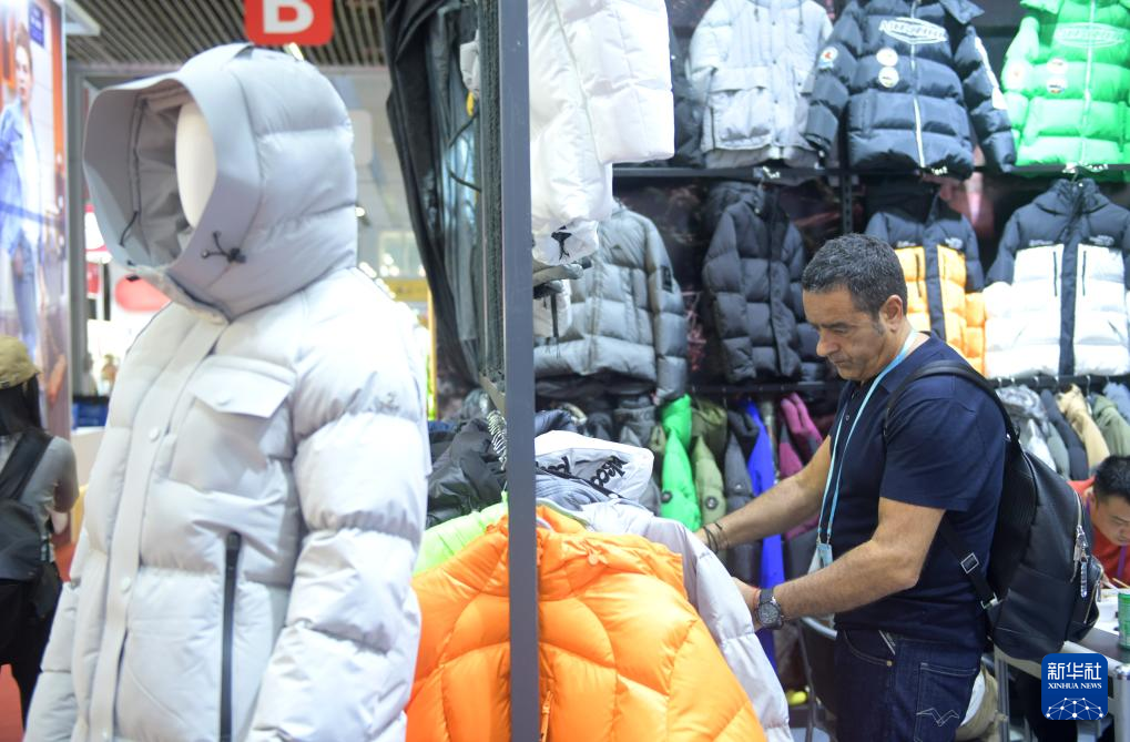 11月4日,客商在广交会上参观选购羽绒服。新华社记者卢汉欣摄
