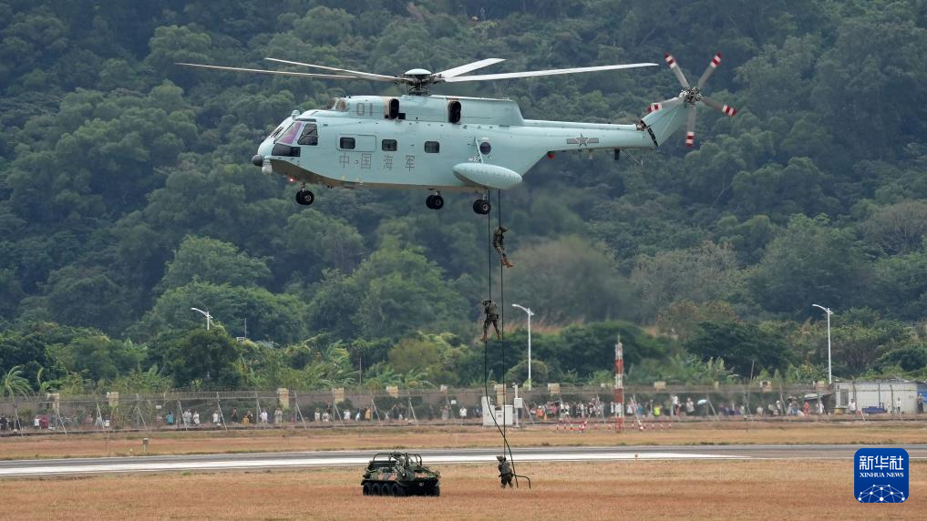 11月10日,海军直-8C运输直升机在广东珠海进行适应性飞行训练,陆战队员滑降后进行课目展示。新华社发(贾成露 摄)
