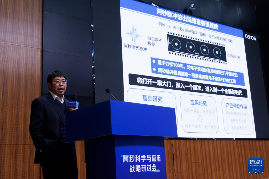 1月10日,在广东东莞阿秒科学中心举行的启动仪式现场,中国科学院物理研究所研究员、先进阿秒激光设施首席科学家魏志义在介绍设施建设进展情况。新华社记者 金立旺 摄