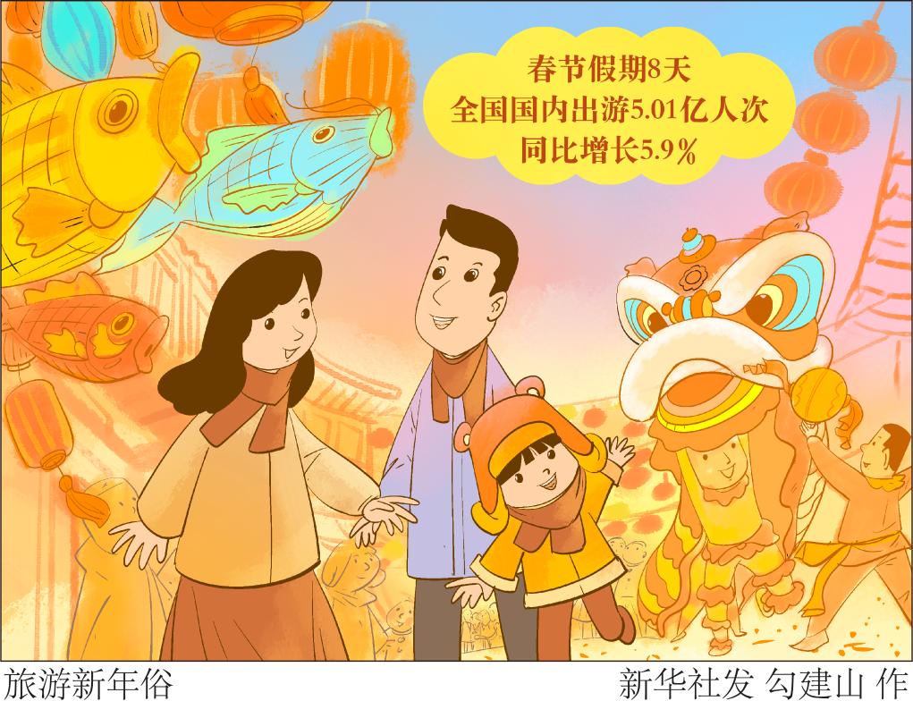 2月5日,文化和旅游部公布春节假期最新数据:春节假期8天,全国国内出游5.01亿人次,同比增长5.9%;国内出游总花费6770.02亿元,同比增长7.0%。全国出游人次和总花费再创新高!