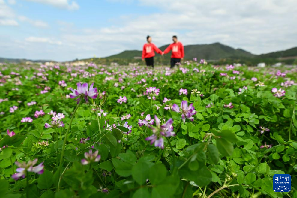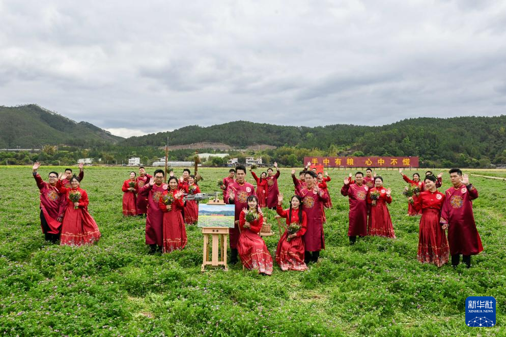 当日,“紫云花海 映影幸福”乡村绿美文化婚庆活动在广东河源市东源县柳城镇万绿智慧农场内举行。15对新人参加集体婚礼,在紫云英花海的见证下,通过植树、花田婚拍等活动践行婚俗新风尚,倡导简约环保的婚庆理念。