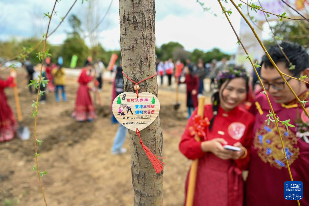 3月16日,新人在集体婚礼中参加植树活动。