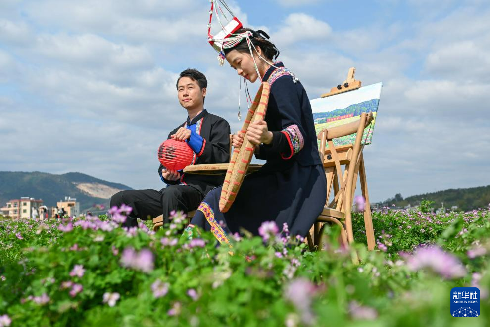 3月16日,新人在广东河源市东源县柳城镇的紫云英花海中婚拍留念。