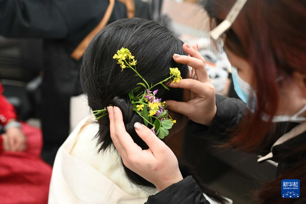 3月16日,在广东河源市东源县柳城镇,化妆师为新娘戴上花饰。