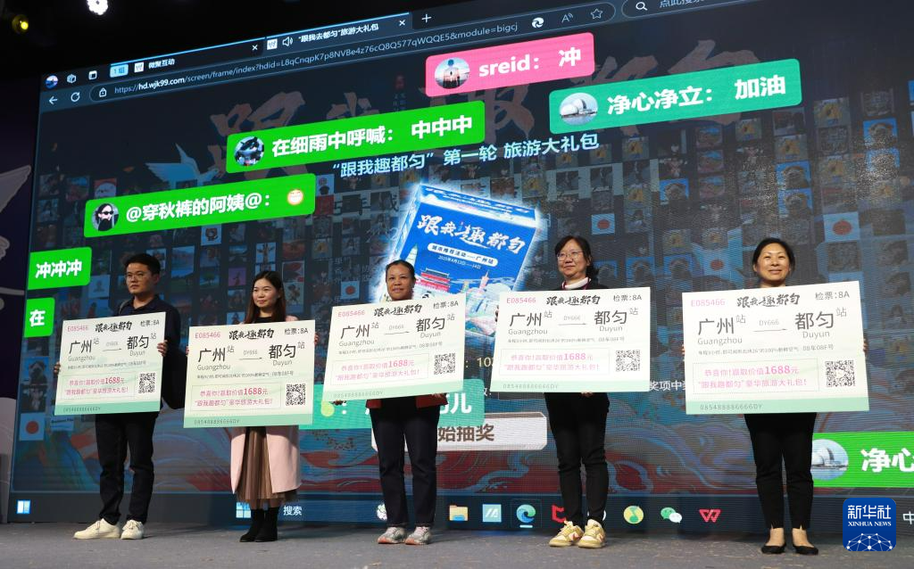4月13日,参加抽奖活动的观众上台领取“跟我去都匀”旅游大礼包。