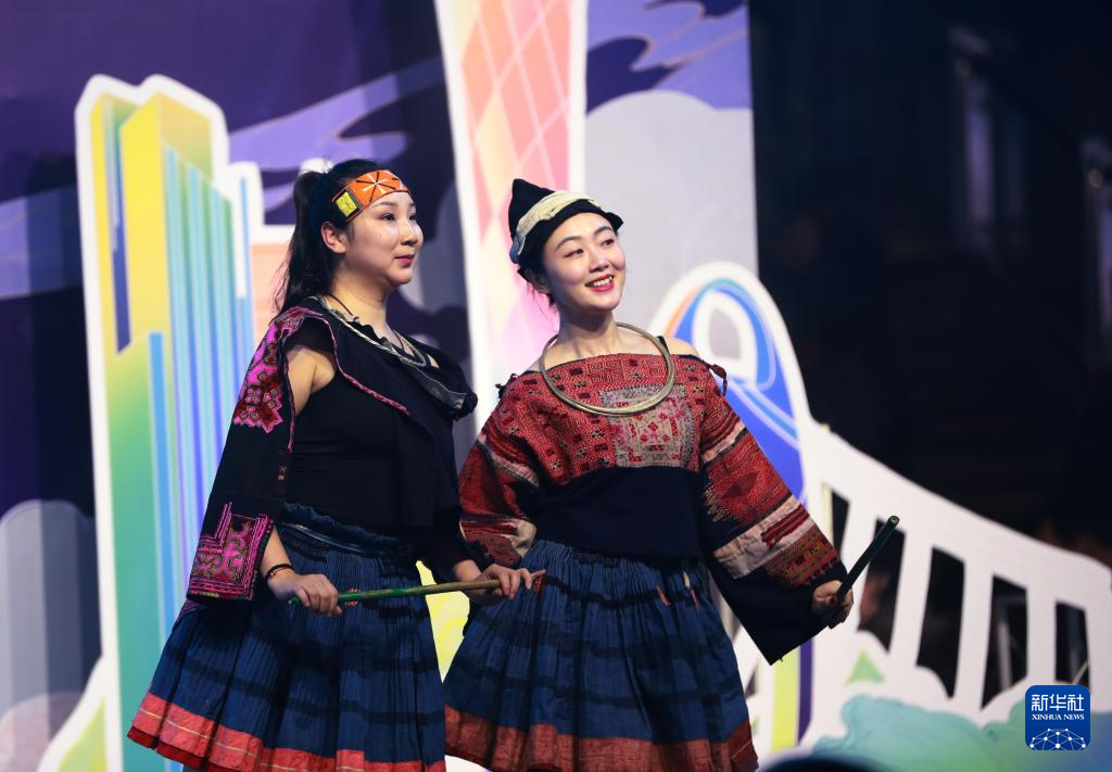 4月13日,来自都匀市的演出人员在展示当地特有的民族服饰。