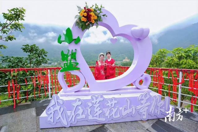 19日,温厝村观景台云雾缭绕,宛如仙境。15对新人身着汉唐华服,在悠扬的古乐中携手攀登99级“同心阶”。阶梯两侧,红绸飘扬,寓意“长长久久”。新人们面向巍峨的莲花山峰行“山盟礼”,共同锁上象征夫妻“永结同心”的同心锁。