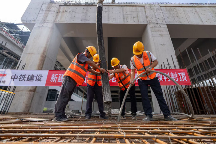 中铁建设集团施工人员在新建佛山站北站房地下主体结构最后一块底板浇筑混凝土。新华社发(邓祯摄)