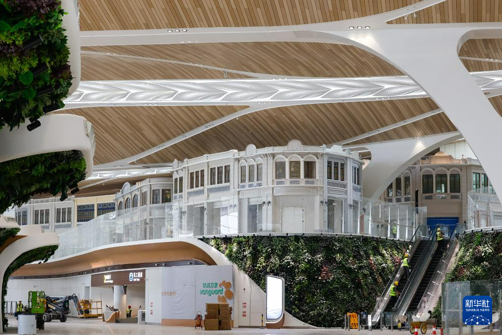 9月29日,施工人员在广州白云机场T3航站楼出发大厅运输石膏板。