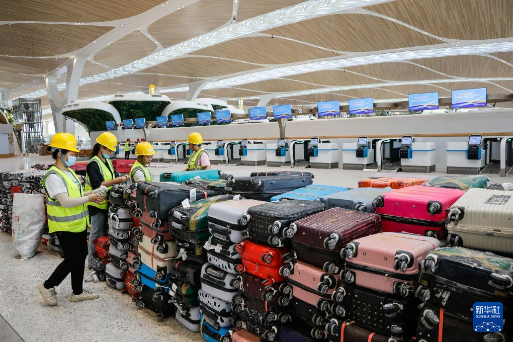 9月29日,工作人员在广州白云机场T3航站楼出发大厅进行值机行李托运测试。