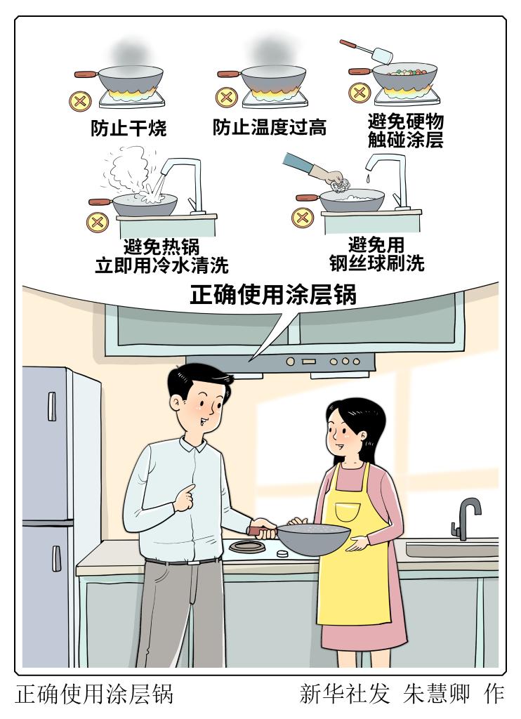业内人士建议,正确使用涂层锅,消费者需要注意以下情况:一是防止干烧。空锅加热会使温度在短时间内快速上升,而每种涂层都有使用温度上限。二是防止温度过高。放油之后不要等冒油烟再放菜,过高温度会损害涂层。三是避免硬物触碰涂层。选用耐热的硅胶铲或木铲,避免使用金属铲,不烹制硬骨头、贝壳类、螃蟹类坚硬食材,防止刮伤涂层。四是避免热锅立即用冷水清洗。烹饪完成后,刚炒完菜的锅还处于高温膨胀状态,若立即加入冷水,热胀冷缩易导致变形或损坏。五是避免用钢丝球刷洗。清洗锅时,选用柔软的海绵或抹布清洗,防止破坏涂层。