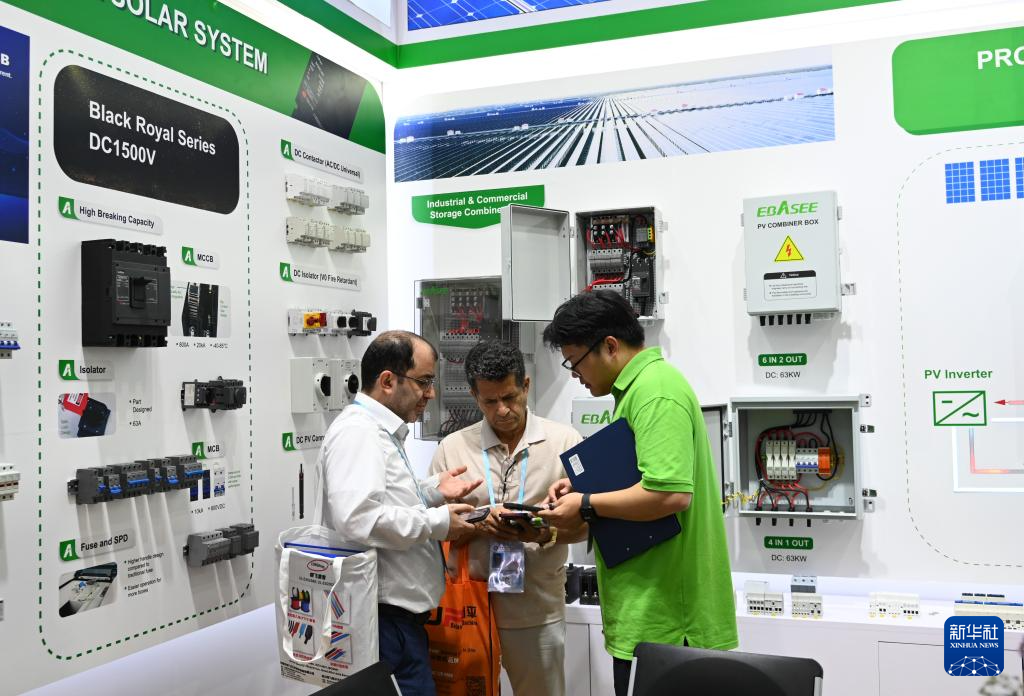 10月19日,客商与展商在第138届广交会展馆日月元科技(深圳)有限公司展台交谈。新华社记者 肖恩楠 摄