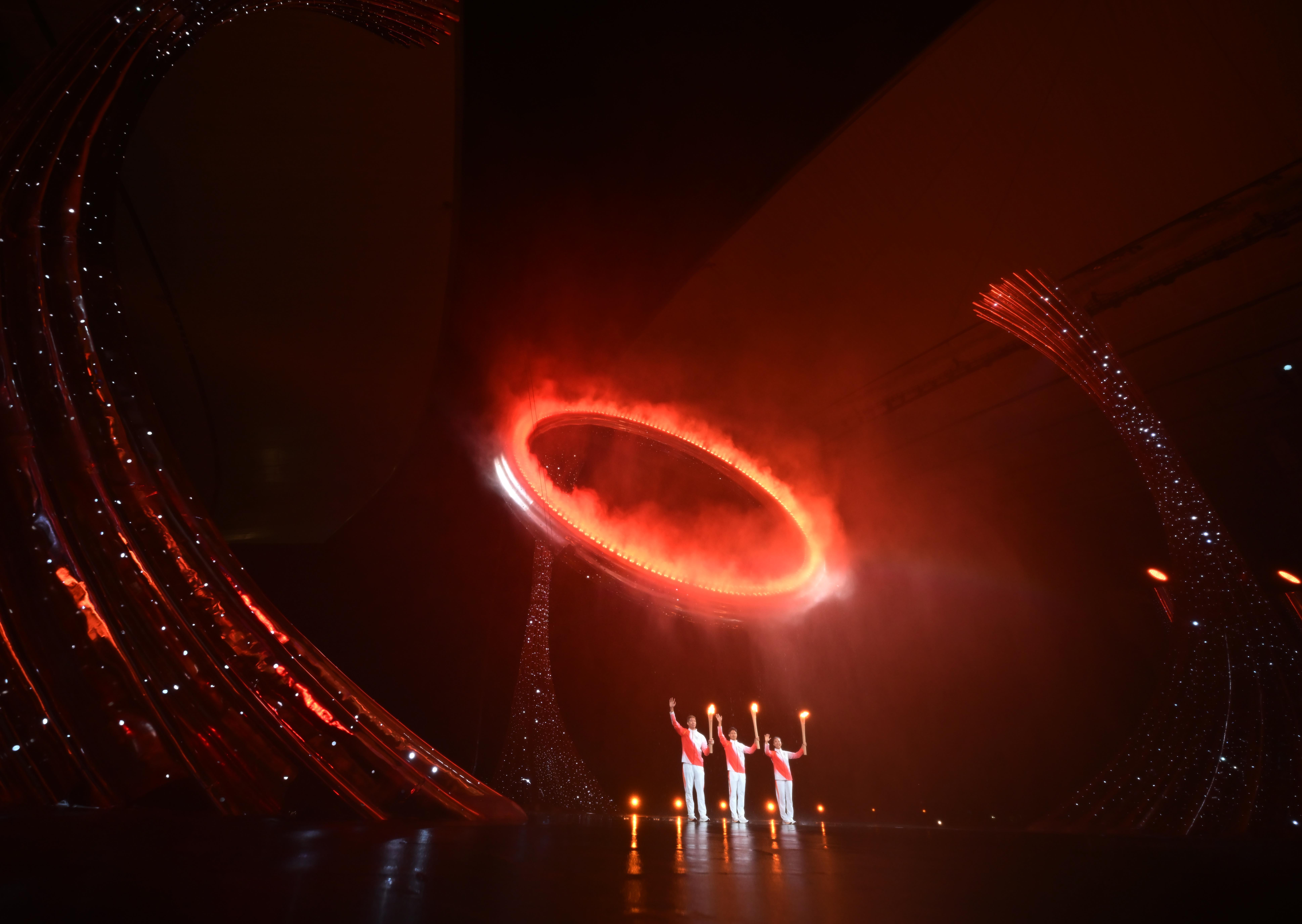 11月9日,火炬手苏炳添(中)、张家朗(左)、李祎点燃主火炬后向观众致意。图/新华社