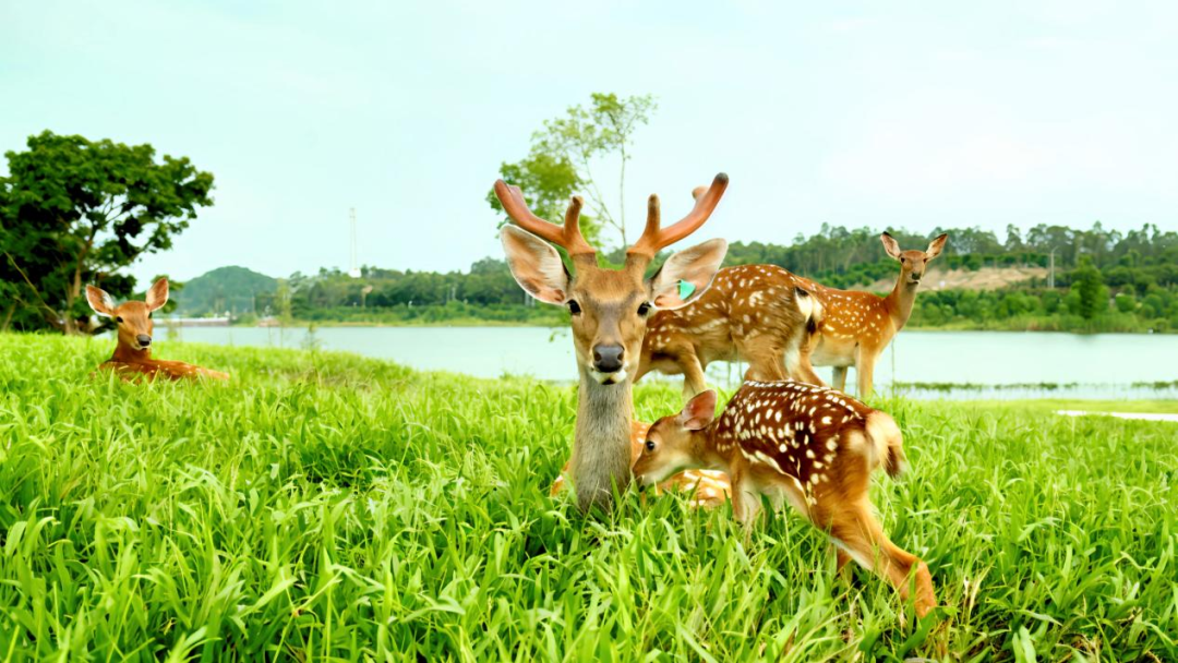 在鹿鸣半岛,湖畔半岛栖息着一群温顺的梅花鹿,4~6月时鹿身白斑尤为清晰明艳,毛色宛如雪中落梅。游客只需购买10元/份的指定饲料,就能体验小鹿轻蹭掌心的治愈瞬间,也可静坐观景台,欣赏鹿群饮水、夕阳映湖的静谧诗意画面。