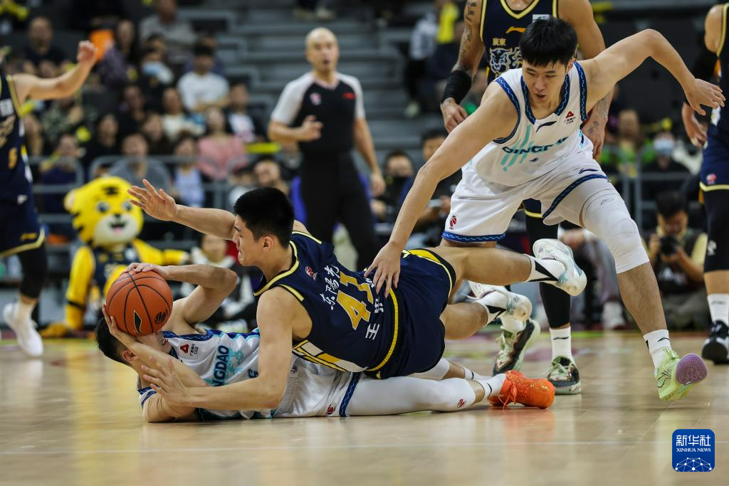 12月21日,广东东阳光队球员王洪泽(中)在比赛中倒地拼抢。