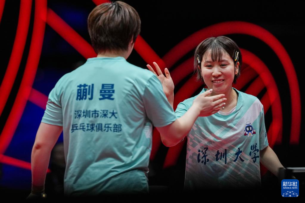 12月28日,深圳大学队组合蒯曼/平野美宇(右)在双打比赛中庆祝得分。她们3比0战胜山东鲁能队组合钱天一/陈幸同。