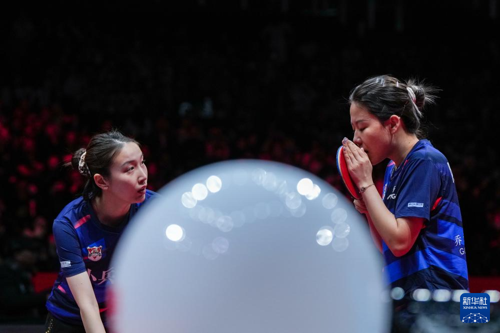 12月28日,山东鲁能队组合钱天一/陈幸同(右)在双打比赛中商讨战术。她们0比3不敌深圳大学队组合蒯曼/平野美宇。