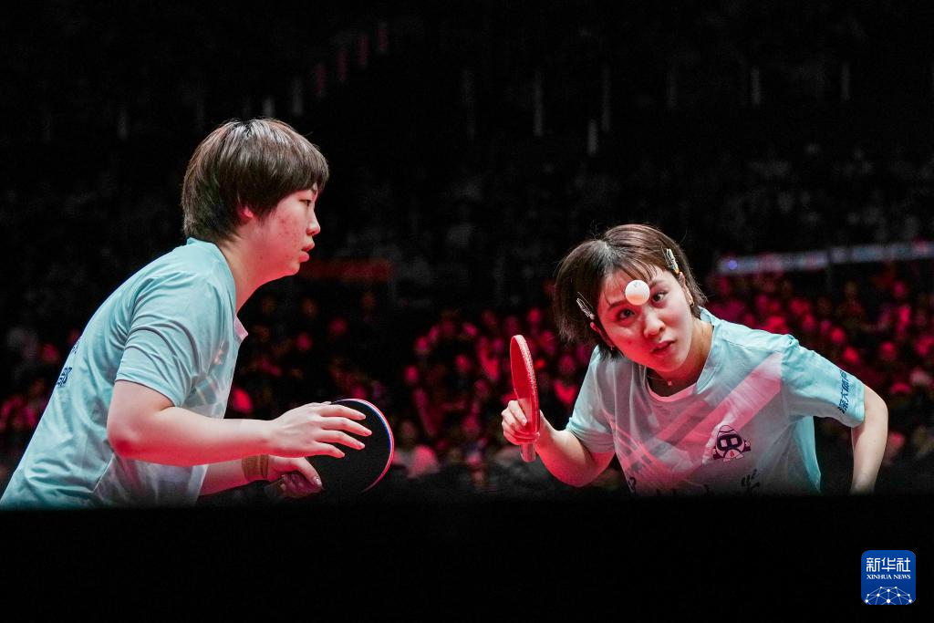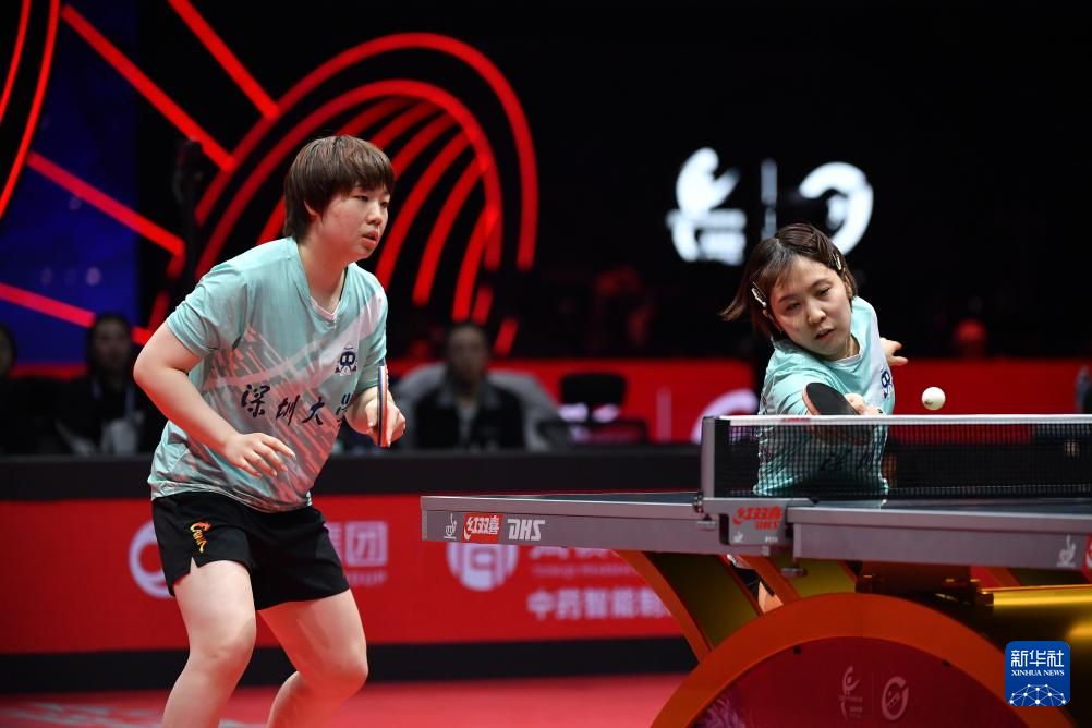 12月28日,深圳大学队组合蒯曼/平野美宇(右)在双打比赛中。她们3比0战胜山东鲁能队组合钱天一/陈幸同。