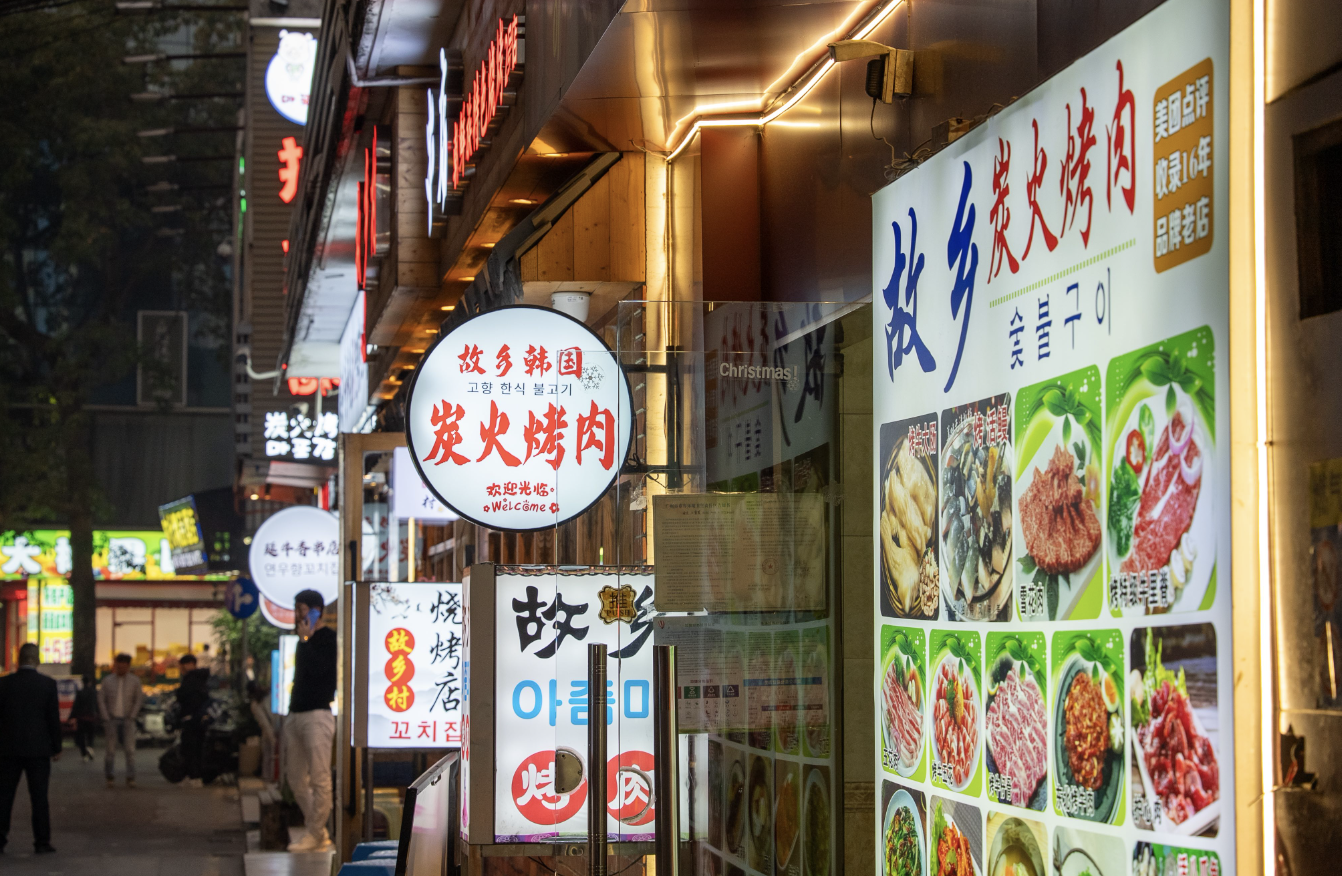 夜幕降临,沿街商铺的霓虹灯次第亮起,烤肉店内举杯声交织,烤盘上的牛肉滋滋作响,香气漫出街巷……全长仅800余米的远景路,已经从昔日零星的韩式餐馆聚集地,蝶变为远近闻名的风情街,处处充满着烟火气息。
