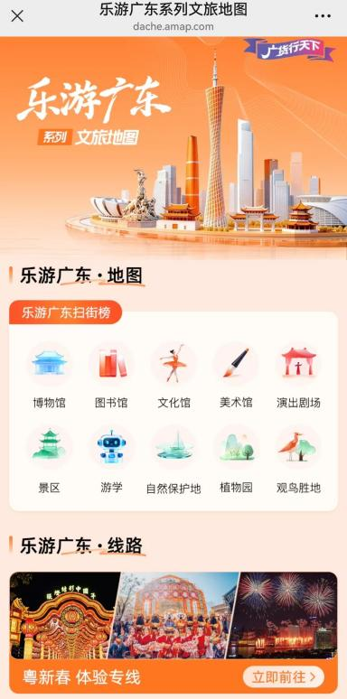 该地图紧扣“打造广东文旅智能门户”目标,上线AI文旅助手,可提供24小时智能问答。该地图对广东省21地市新春活动资讯进行集中发布,探索实现广东省重点文旅品牌活动一体化整合,上线“请到广东过大年”“广货行天下 非遗乐万家”等新春活动,推荐10条“粤式新潮流”春节文旅线路,串联全省各地特色节庆活动与非遗体验点位,策划72条精品旅游线路,丰富市民游客出游选择。