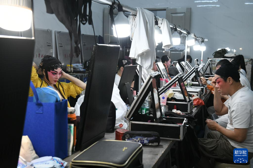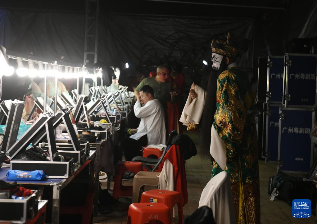 2月25日晚,在广东省湛江吴川市塘下村文化广场,广东粤剧院一团演员在后台化妆,准备演出。新华社发(许建梅 摄)
