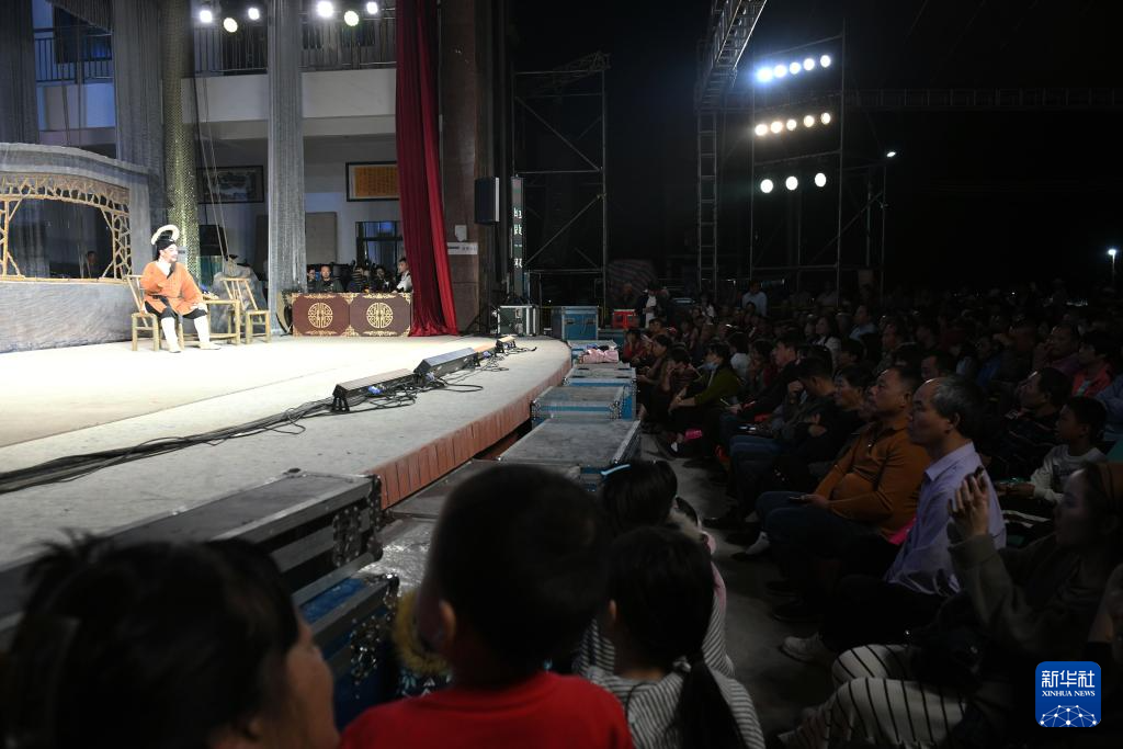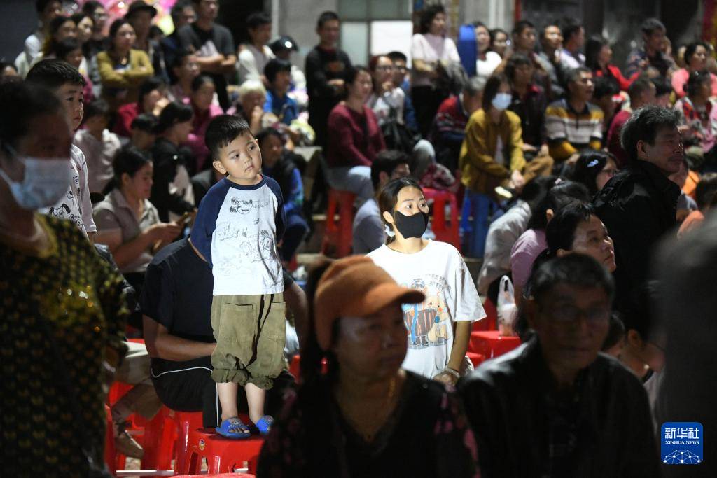 2月28日晚,在广东省茂名化州市杨梅镇北亨村,群众观看广州粤剧院下辖广州红豆粤剧团的演出。新华社发(许建梅 摄)
