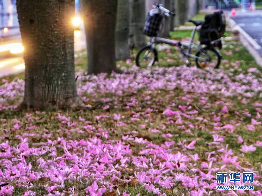 美丽异木棉花瓣飘落到草地上,留下满地粉色,绚丽夺目。新华网发(佘建新摄)