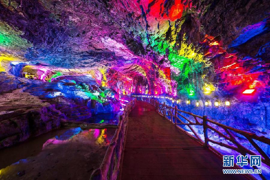图为万山朱砂古镇“地下长城”。此景源于开采了逾两千多年的万山汞矿废弃矿坑,千年矿坑,配上绚丽的灯光,梦幻又唯美,被称为景区最美景观。